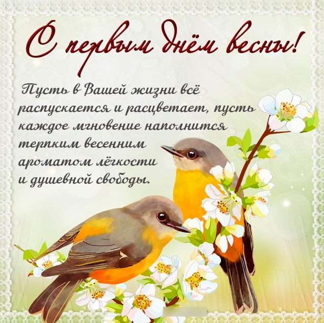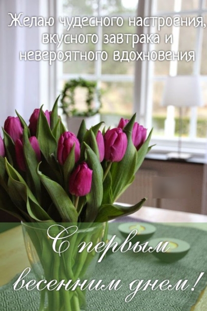 Доброе утро с первым днем весны! Новый день начинается свежестью и радостью, которые приносит с собой весеннее пробуждение природы. Солнечные лучи ласково проникают сквозь занавески, наполняя комнату теплом и светом. За окном слышен веселый щебет птиц, которые приветствуют нас своими песнями.