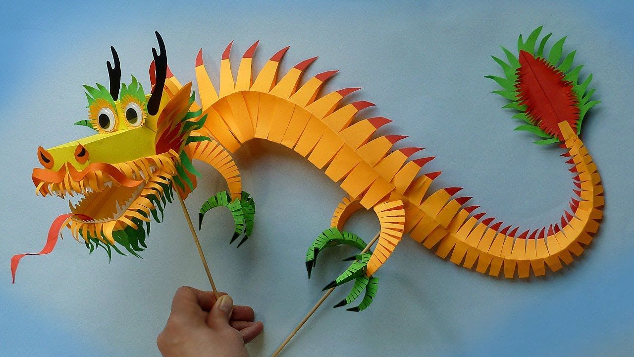 Тело дракона можно сделать зеленым или красным, а крылья – желтыми или оранжевыми. Глаза и рот можно вырезать из черной бумаги. Дети могут добавить свою фантазию и создать уникальную поделку, добавив золотые чешуйки на тело или перья на крылья.
